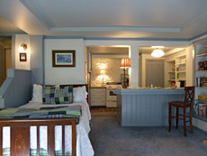 The Garden Suite features a full-size bed, a writer's nook, a gas fireplace, a full kitchen, a bathroom (with fluffy towels, shampoos, soaps and robes), a TV and DVD player and jars filled with candy!